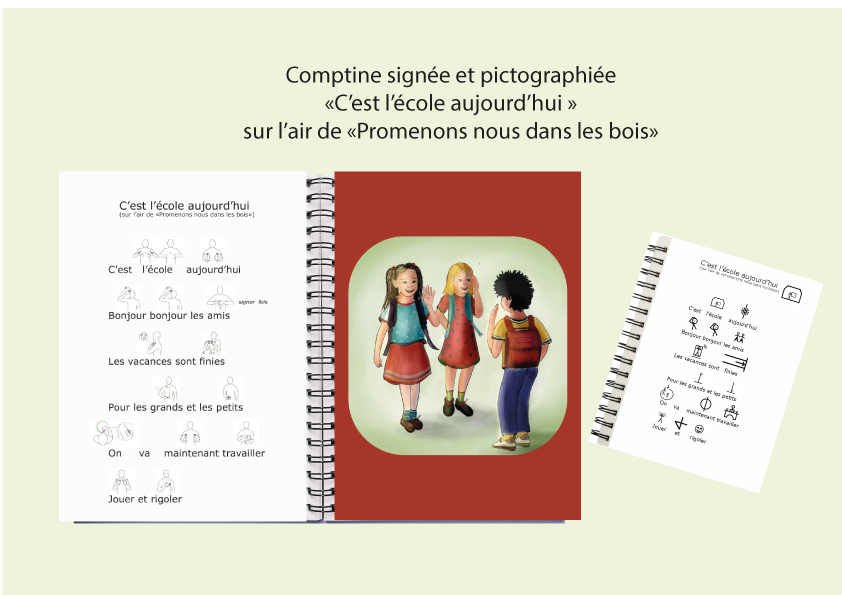 • Comptine signée « C’est l’école aujourd’hui » sur l’air de « Promenons nous dans les bois ». Vocabulaire, pictogrammes et signes Makaton : école- aujourd’hui- vacances- travailler- jouer- rigoler
