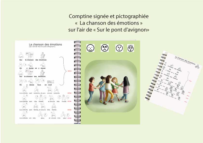 • Comptine signée « Sur la chanson des émotions » sur l’air de « Sur le pont d’Avignon » . Vocabulaire, pictogrammes et signes Makaton : chanson-danser-émotions-peur-triste-fâché(en colère)-content- enfants