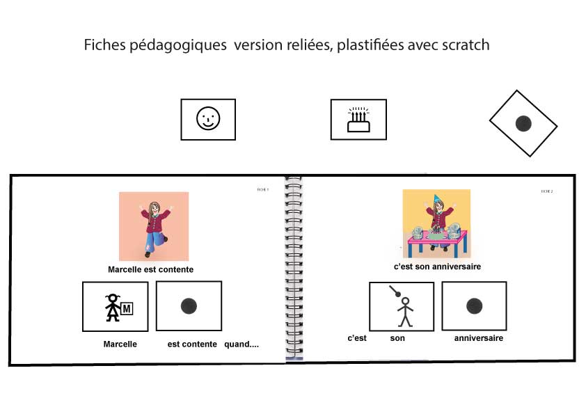 Fiches pédagogiques de l’album « Marcelle est contente  » reliées, plastifiées avec scratchs.