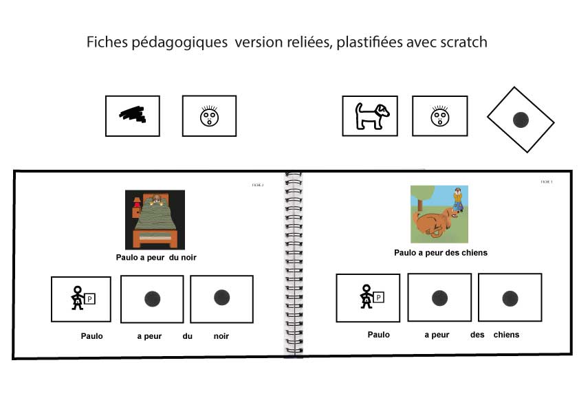 Fiches pédagogiques de l’album « Paulo a peur » reliées, plastifiées avec scratchs.