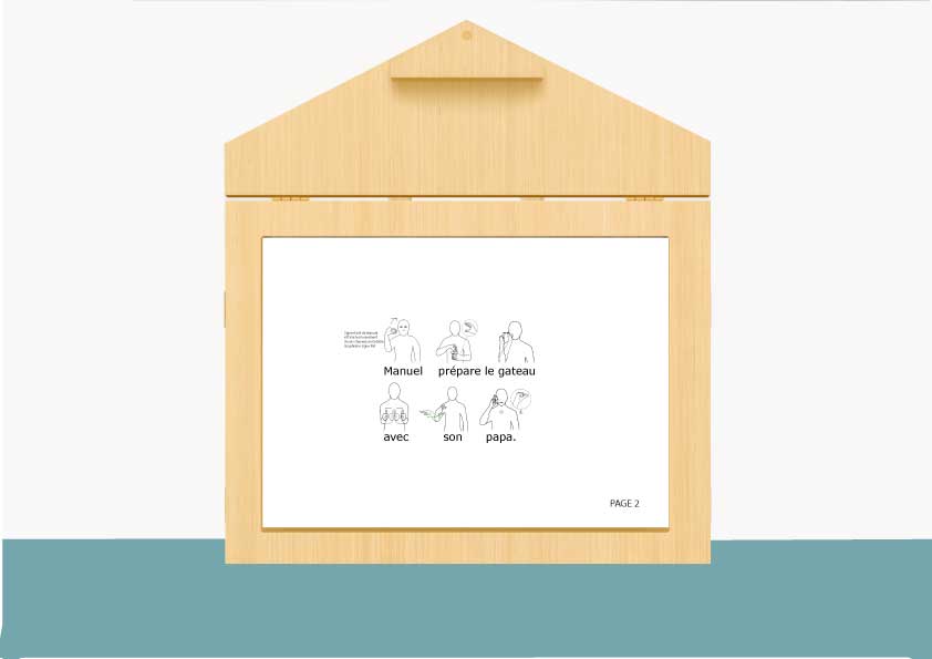 Illustrations de l’album « L’anniversaire de Manuel  » ; textes avec les signes Makaton au verso.