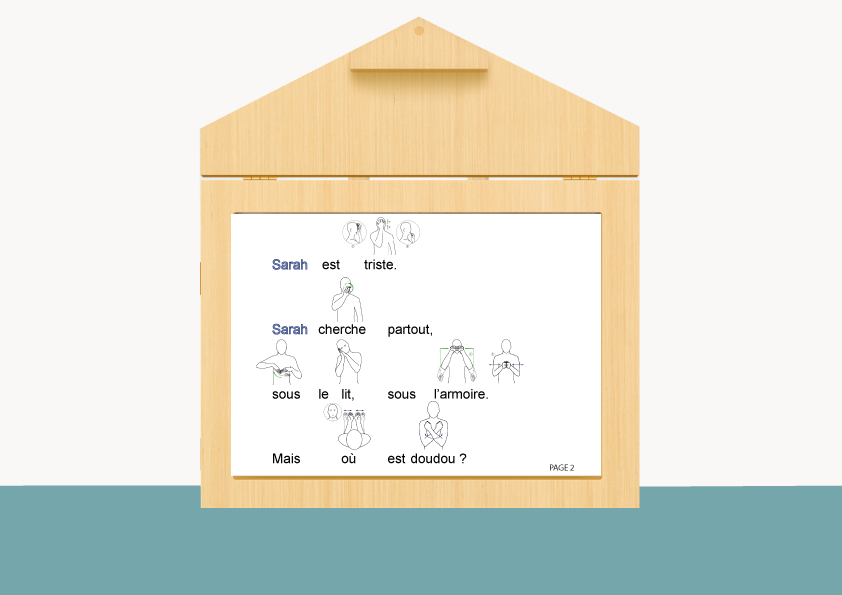 Illustrations de l’album « Ouh ouh doudou  » ; textes avec les signes Makaton au verso.