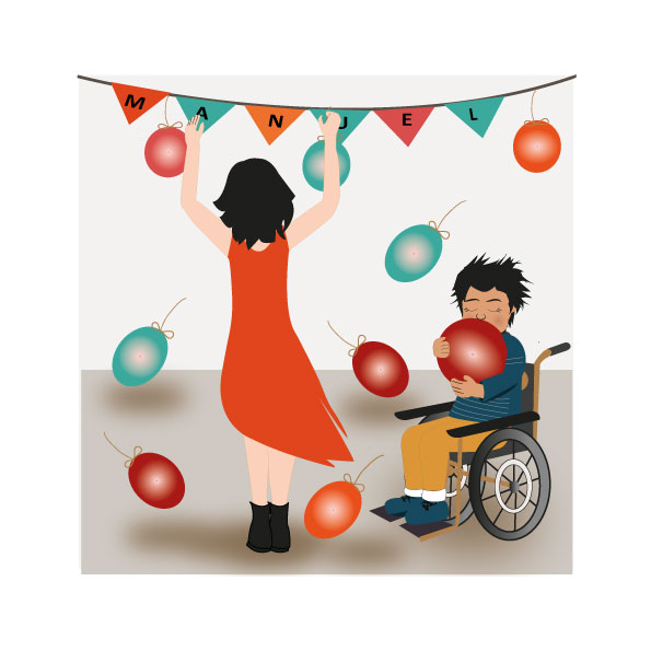 Manuel est un enfant en fauteuil roulant mais, son handicap n’est pas mentionné dans l’histoire. C’est tout simplement son anniversaire !